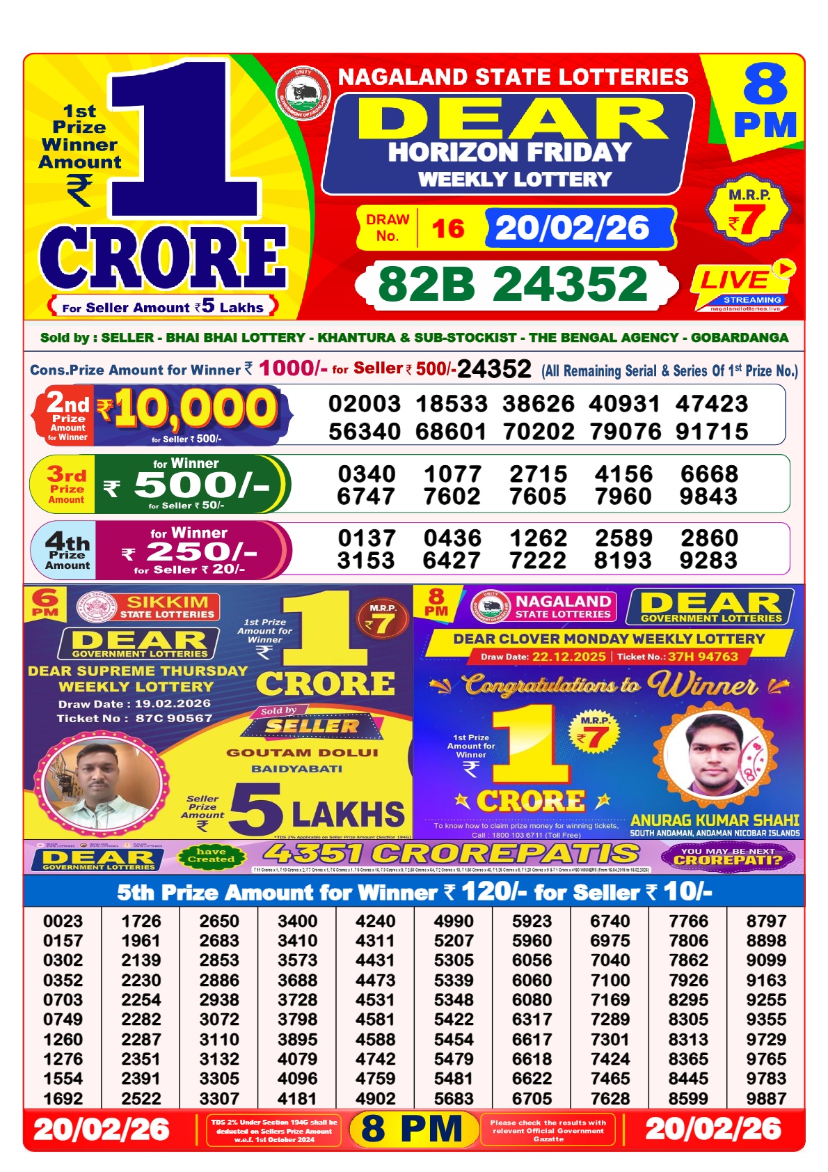 The Nagaland State Lottery Sambad 8pm first prize money is Rs. 1Cr. only/-